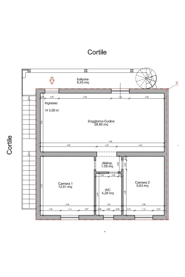 Appartamento piano primo; composto da soggiorno con angolo cottura, un piccolo disimpegno, due camere da letto, un bagno e un balcone ballatoio.