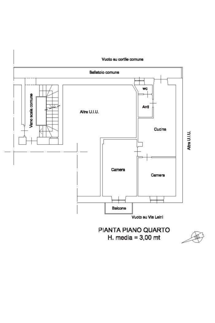 Unità immobiliare al piano quarto (5 f.t.): alloggio con ingresso dal ballatoio con affaccio su cortile condominiale, composto di due camere, soggiorno con angolo cottura e servizi, al piano sotterraneo: un locale ad uso cantina pertinenziale.