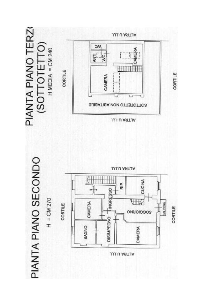 Alloggio dislocato su due livelli piano secondo e piano terzo-sottotetto, collegati tra loro mediante una scala interna, composto al piano secondo di ingresso verso soggiorno, cucina, ripostiglio, due camere, disimpegno e bagno e al piano terzo-sottotetto di un vano unico destinato a camera e bagno. L'alloggio ha annessa cantina pertinenziale. Autorimessa posta al piano terra avente accesso dal cortile e costituita da unico vano.