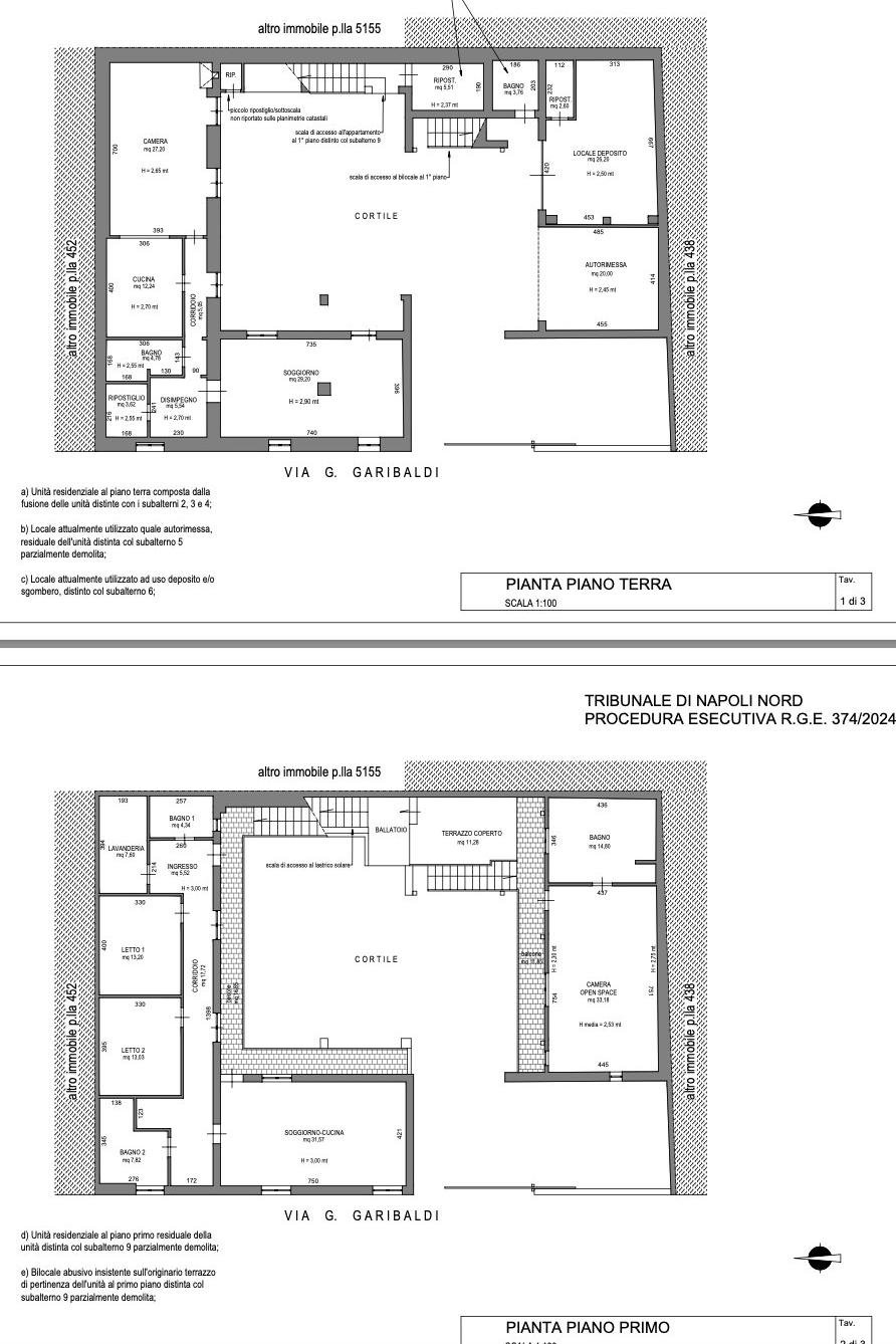 Edificio residenziale con cortile, composto, al piano terra da appartamento con soggiorno, cucina, bagno, camera con camino, disimpegno, corridoio, ripostiglio e piccolo wc nel cortile, da vano autorimessa e locale deposito composto da vano e piccolo ripostiglio; al piano 1 da appartamento con lastrico solare, composto da ingresso, soggiorno-cucina, 2 camere, 2 bagni, lavanderia e corridoio, con ampio balcone e da bilocale con ampia camera e bagno e con balcone e terrazzo coperto.