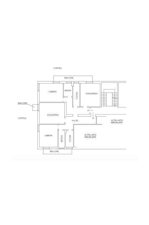 Appartamento secondo piano composto da soggiorno, cucina, quattro camere, due bagni e due balconi. Completa la proprietà una cantina al livello S1.