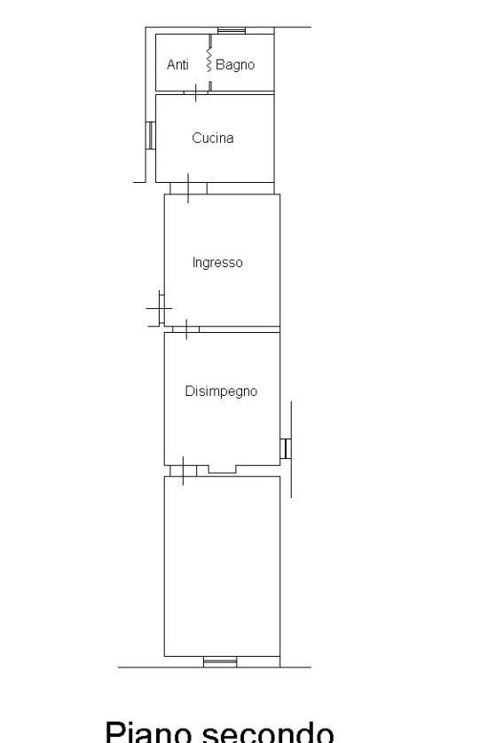 Appartamento secondo piano composto da ingresso, cucina, disimpegno, camera, ripostiglio e bagno.