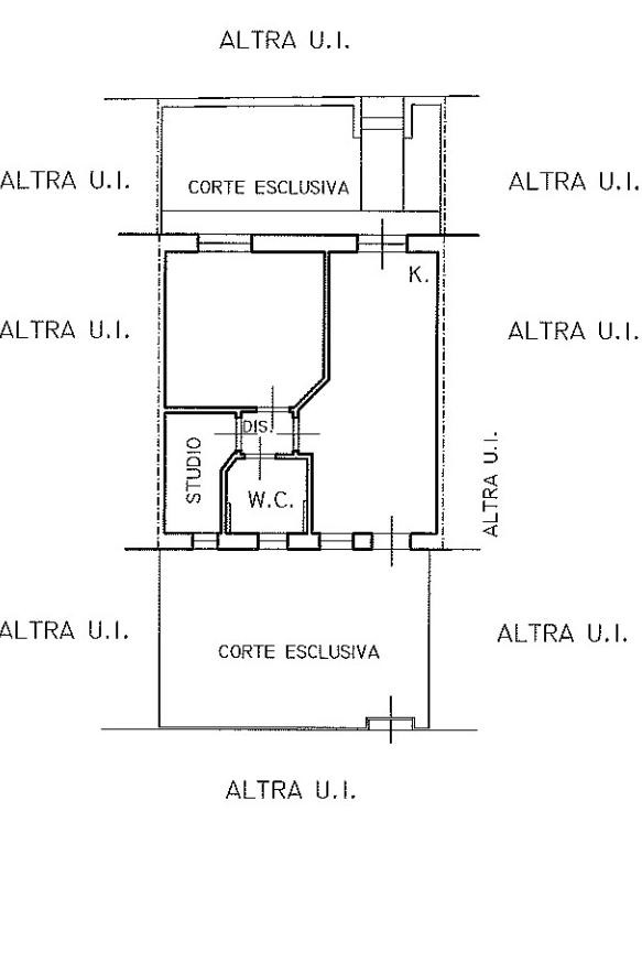 Appartamento primo piano composto da soggiorno, angolo cottura, bagno, studio e camera. Completano la proprietà un cortile privato, un posto auto coperto e un locale sgombero al piano terra.