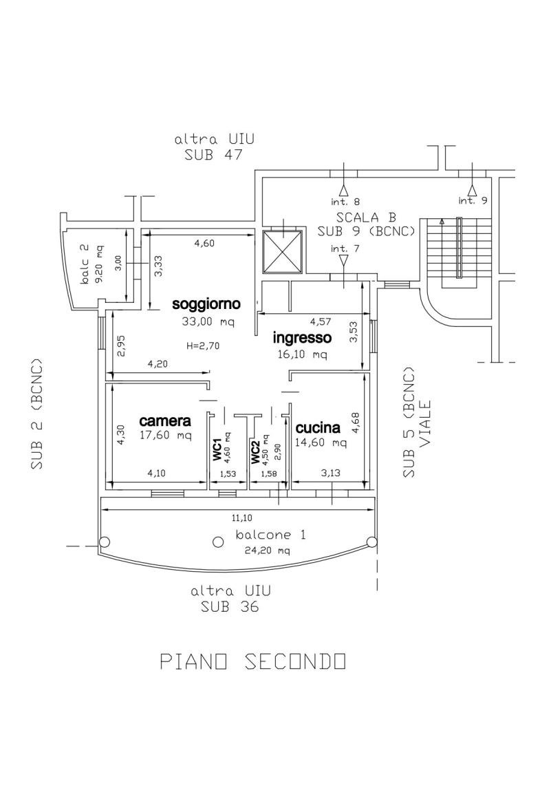 Appartamento al piano secondo, si compone di ingresso, un soggiorno doppio, una camera, una cucina abitabile, due bagni e due balconi.