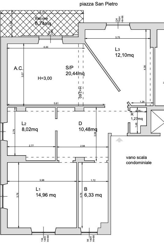 Appartamento primo piano composto da soggiorno, angolo cottura, tre camere, bagno, ripostiglio e balcone.