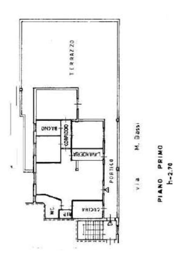 Abitazione al primo piano. L'immobile è composto dai seguenti locali: cucina di mq. 7,13; soggiorno di mq. 19,20; pranzo di mq. 16,81; corridoio di mq. 7,92; dispensa di mq. 1,80; camera da letto di mq. 17,86; camera da letto di mq. 12,95; camera da letto di mq. 10,80; bagno di mq. 6,00; bagno di mq. 6,37; lavanderia di mq. 5,38.