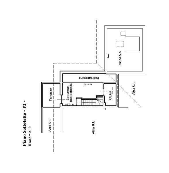 Appartamento distribuito su due livelli. Piano primo composto da soggiorno, cucina, disimpegno, camera bagno e terrazzo. Piano sottotetto composto da camera, bagno e terrazzo. Completa la proprietà una cantina al livello interrato.