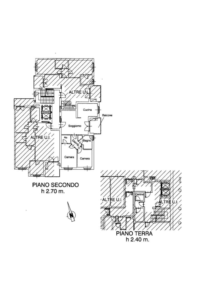 Alloggio al piano secondo, composto di soggiorno, cucina, disimpegno, bagno, due camere, ripostiglio e balcone; cantina al piano terreno.