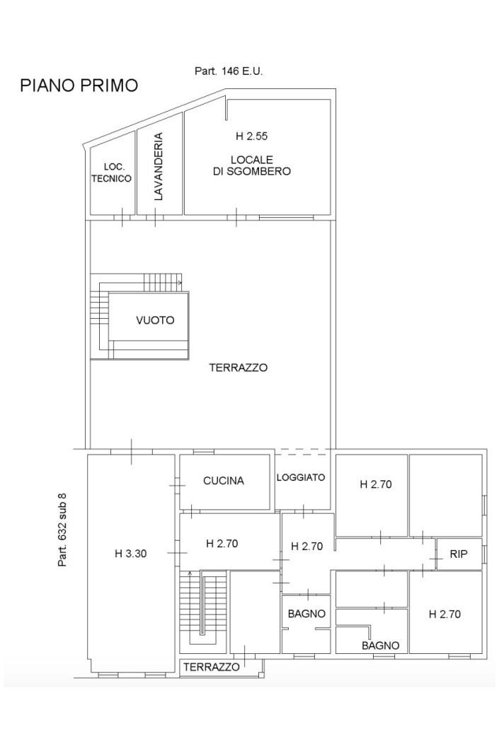 Appartamento distribuito su due livelli. Piano terra composto da ingresso, ripostiglio e scala. Piano primo composto da disimpegno, salone, cucina, saloncino, due bagni, tre camere, ripostiglio, balcone e ampio terrazzo. Completano la proprietà un garage e un locale sgombero.