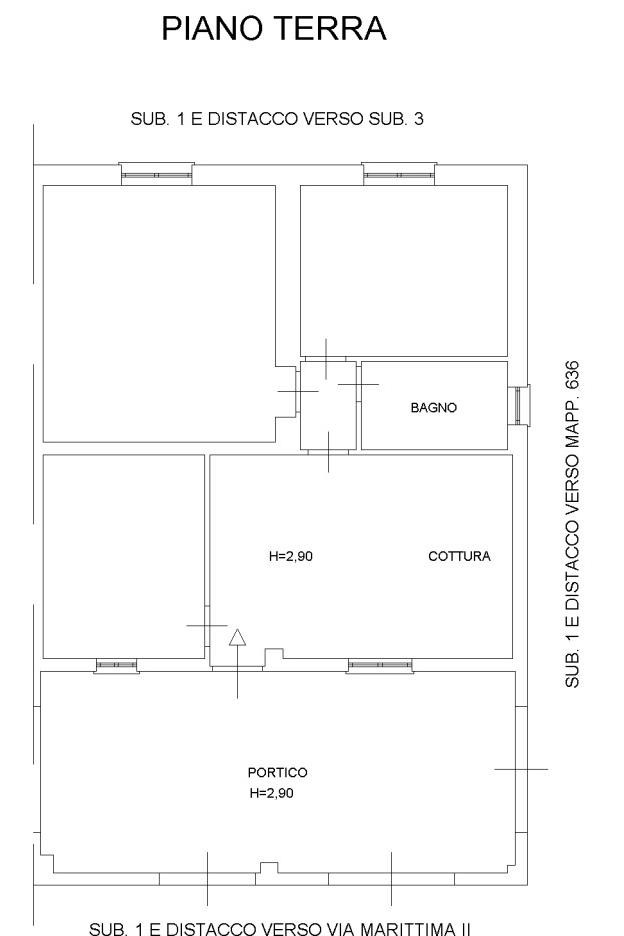 Appartamento piano terra composto da soggiorno, angolo cottura, tre camere, bagno e portico.