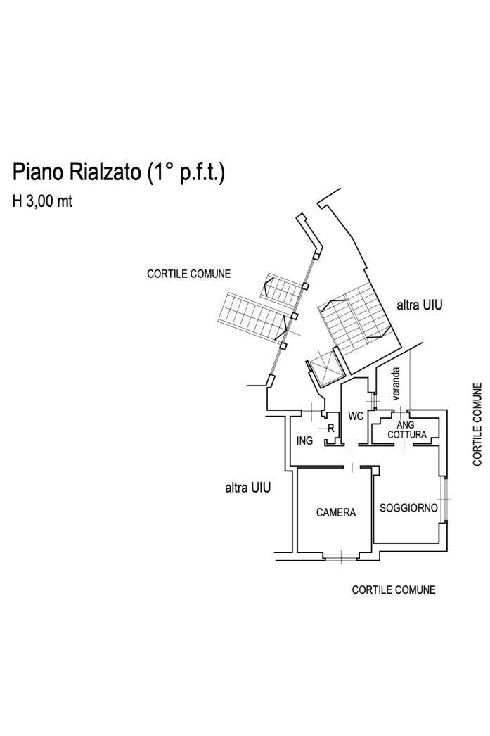 Alloggio al piano rialzato (1° fuori terra) composto da ingresso, corridoio, soggiorno, angolo cottura, camera, bagno, ripostiglio e veranda esterna, oltre cantina al piano seminterrato.