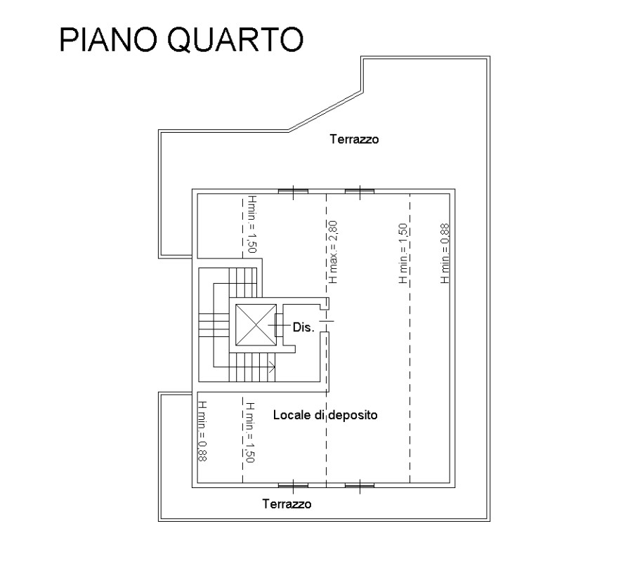 Appartamento terzo piano composto da soggiorno, tre camere due bagni e due balconi, oltre a deposito al quarto piano composto da soggiorno, cucina, bagno, due ripostigli e terrazzo. Completa la proprietà una cantina al livello seminterrato.