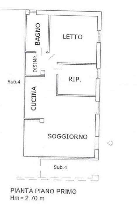 Unità immobiliare posta al piano primo composta da ingresso, soggiorno/pranzo, piccolo disimpegno, due camere e un bagno.
