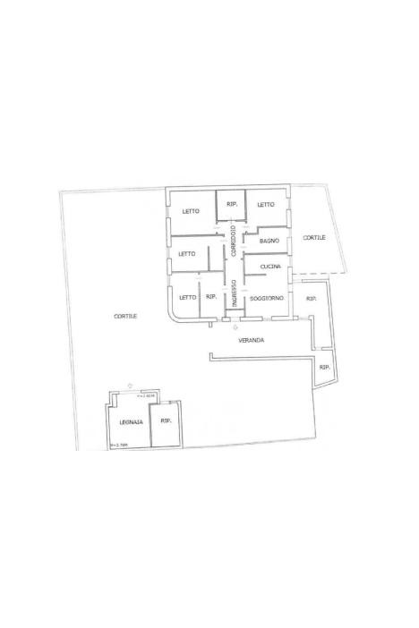 Appartamento al piano terra con area di corte e locali di sgombero. Composto da veranda, soggiorno-cucina, ripostiglio, tre camere e un bagno.