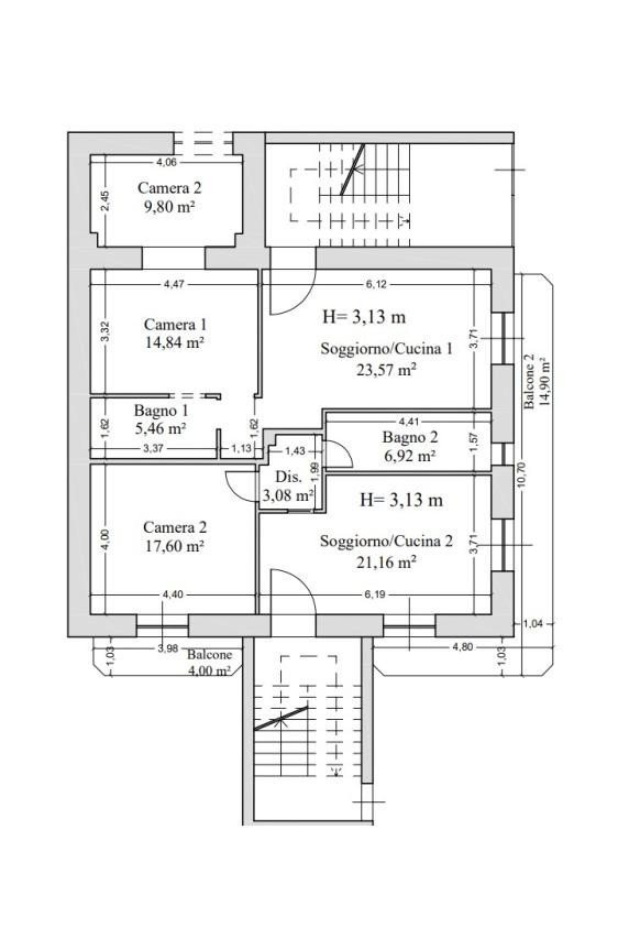 Appartamento al piano rialzato, suddiviso in n.2 unità abitative: l'unità 1 è composta da due vani ed accessori (cucina/soggiorno, camera, bagno e balcone); l'unità 2 è composta da due vani ed accessori (cucina/soggiorno, camera e bagno e due balconi).