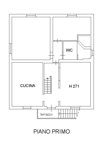 Abitazione distribuita su due livelli. Piano terra composto da locali sgombero e due bagni. Piano primo composto da soggiorno, cucina, disimpegno, tre camere e bagno. Completano la proprietà un giardino privato e un locale esterno ad uso ripostiglio.