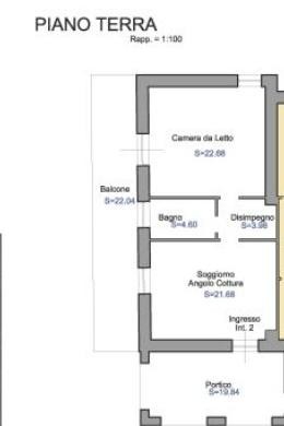 Appartamento piano terra composto da soggiorno con angolo cottura, camera, bagno, disimpegno, portico e terrazzino.