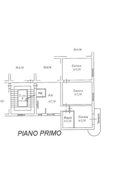 Appartamento primo piano composto da ingresso, soggiorno, cucinotto con ripostiglio, tre camere, bagno e balcone.